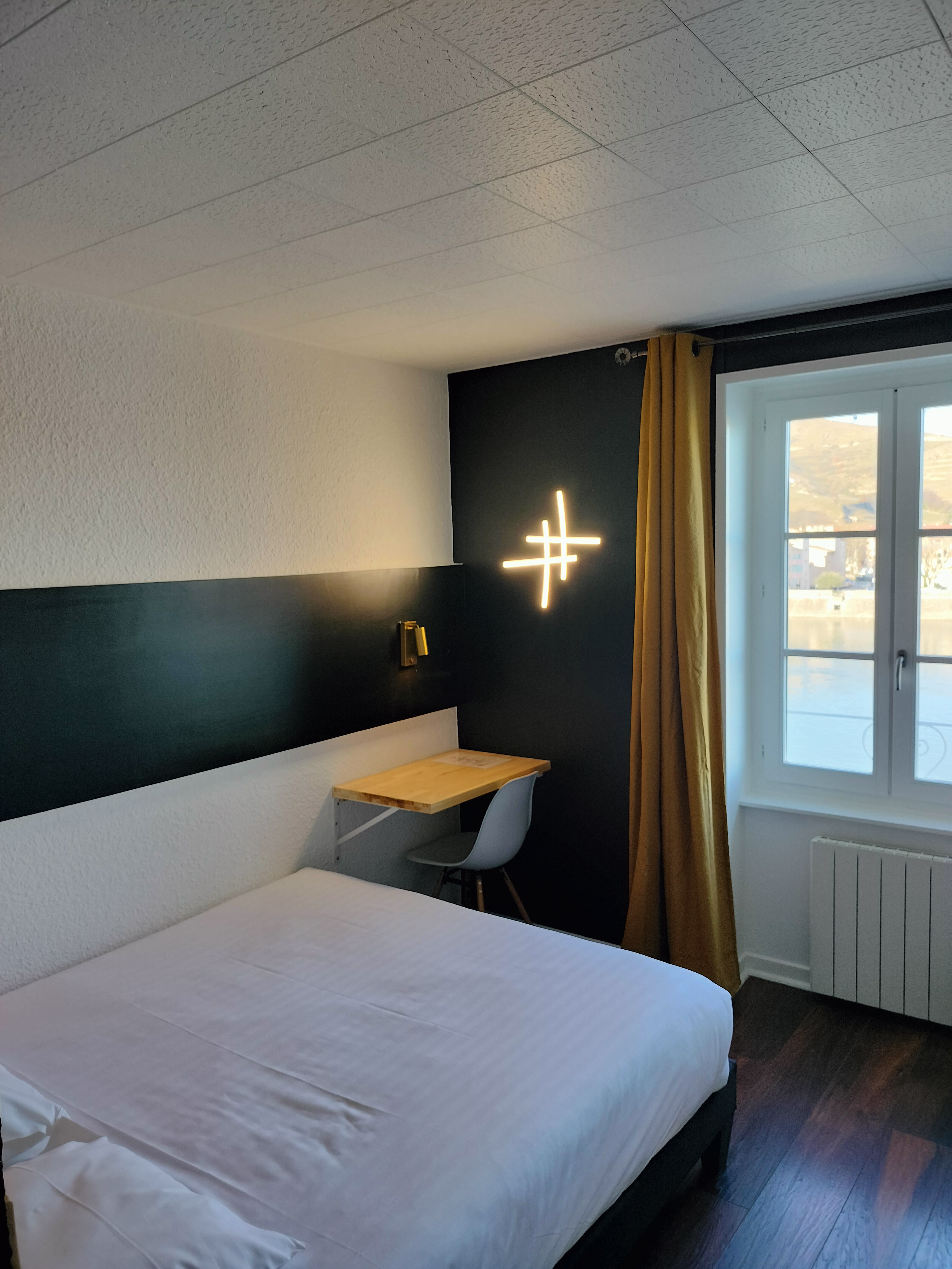 Nos chambres Doubles Supérieures vue sur Rhône disposent d'un grand lit double 180x200 cm, d'une salle de bain privative avec douche et toilettes séparées.